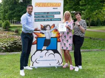 Im Mai überreichte Rechts- und Fachanwalt Steffen Majoyeogbe, Spezialist für Wettbewerbsrecht, Markenrecht und IT-Recht, WbI Geschäftsstellenleiterin Meike Ströhmer im Beisein von Claudia Schauder, Teamleiterin beim Jobcenter Dortmund, die Urkunde. Der Titel der erfolgreichen Power-Linie des WbI ist aus einem Brainstorming mit Claudia Schauder hervorgegangen, die sich ein impulsstarkes Angebot „mit Pepp“ für potenzielle Existenzgründerinnen wünschte.